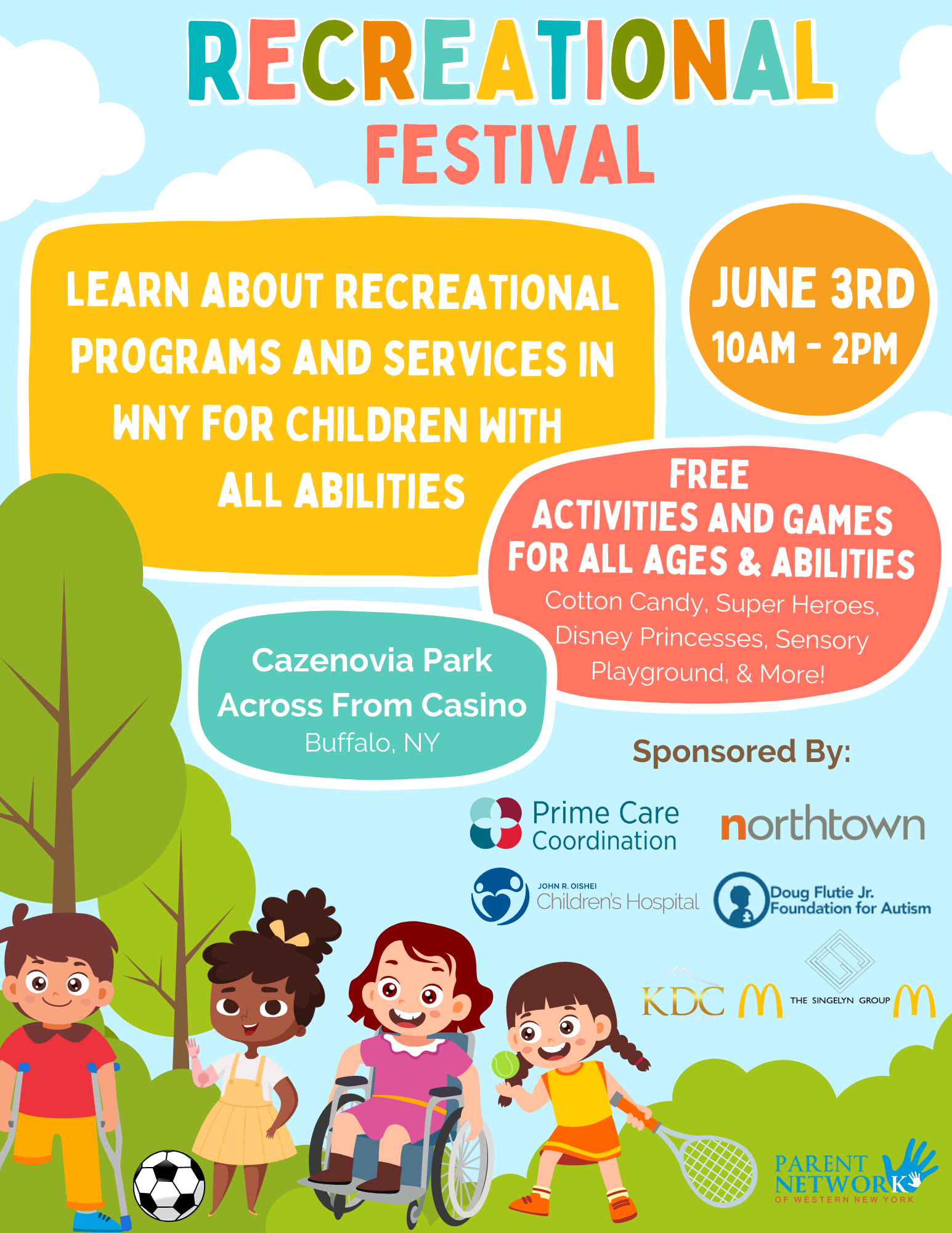 Parent Network of WNY brings you our annual Recreational Festival! On June 3rd from 10 am – 2 pm, join us at Cazenovia Park in front of the casino in Buffalo, NY.